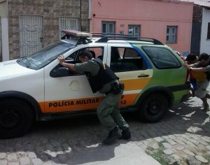 Tem circulado nas redes sociais a foto de policiais militares de Quixeramobimempurrando uma viatura com aparentes problemas mecânicos. Populares ajudam a empurrar o veículo.